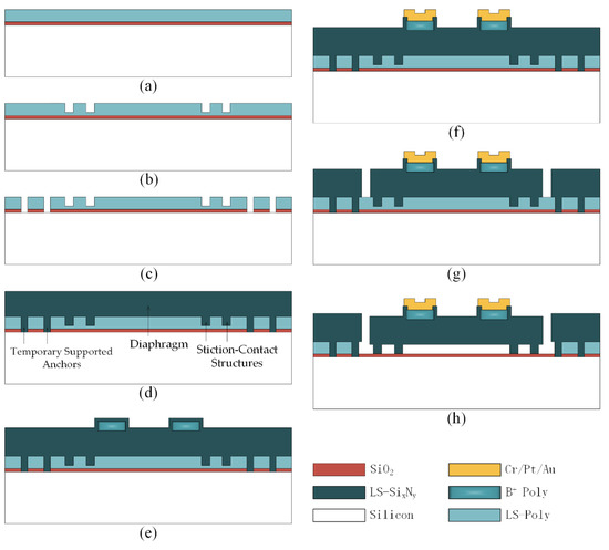Process flow of the tactile sensor with a silicon nitride diaphragm. (a) A 450 nm-thick SiO2 layer is thermally grown to protect the substrate, followed by the deposition of 800 nm-thick sacrificial layer; (b) etching and LPCVD deposition to determine the distance between the stiction-contact structures and the substrate; (c) etching to form the channel for temporary supported anchors; (d) formation of the diaphragm of the tactile sensor, stiction-contact structures, and temporary supported anchors; (e) the 200 nm-thick low-stress silicon nitride layer is deposited after the formation of the piezoresistors; (f) a composite metal layer of Cr/Pt/Au is sputtered and patterned on the piezoresisitors after the contact windows of the piezoresisitors are formed; (g) formation of the release channel of the polysilicon sacrificial layer; (h) the XeF2 etching technique is employed to remove the polysilicon sacrificial layer, followed by the stiction-contact structures temporarily bonded to the substrate using the stiction effect.