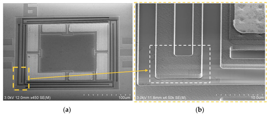 To analyze the stiction of the fabricated tactile sensor further, scanning electron microscopy (SEM) was employed. The SEM view of the temporary supported beam of the fabricated tactile sensor is shown in Figure 9. Figure 9b shows an enlarged view of the temporary supported beam shown in Figure 9a. As the Figure shows, the temporary supported beam is temporarily bonded to the substrate owing to the stiction effect.