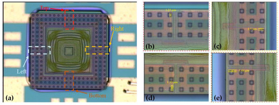 The fabricated tactile sensor was first bonded to the reroute substrate by Fintech FinePlacer Lambda (Finetech GmbH & Co. KG, Berlin, Germany), and the temperature, force, and time of the flip-chip bonding process were 380 °C, 20 N, and 300 s, respectively. Then, the tactile sensor was transferred to the reroute substrate by applying a pulling force perpendicular to the bonded device, as shown in Figure 10. The tactile sensors with the designed stiction-contact structure areas from 2916 to 9000 were transferred to the reroute substrate, and the optical microscopic view of the transferred devices with minimum and maximum stiction-contact structure areas are shown in Figure 10a,b, respectively. The metal bonding electrode deviations between the tactile sensor and the reroute substrate were measured to estimate the precision of the transferred device after the flip-chip bonding process, as shown in Figure 11. The metal electrode deviations of the top, right, bottom, and left are shown in Figure 11b–e, respectively. As shown in Figure 11b–e, the maximum measured deviation after the flip-chip bonding process is approximately 1.5 μm, which is sufficient for the proposed SETH integration process.