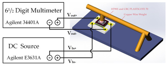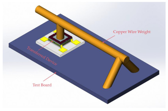 As Figure 11a and Figure 12a show, the size of the transferred tactile sensor is 180 μm × 180 μm × 1.2 μm, and the force area of the tactile sensor is only 120 μm × 120 μm × 1.2 μm. Moreover, the force application accuracy is extremely high because the designed full-scale force of the designed tactile sensor is only approximately 0.5 mN, and there is no suitable instrument to measure the sensitivity of the transferred tactile sensor directly. Therefore, different masses of the beam-shaped copper wire weights with a diameter of 85 μm are made to measure the sensitivity of the transferred tactile sensor, and the measurement principle of the beam-shaped copper wire weight is shown in Figure 13. As Figure 13 shows, one end of the beam-shaped copper wire weight is placed on the sensitive membrane of the transferred tactile sensor, and the other end is placed on the test stage. The force applied to the transferred tactile sensor is half of the mass of the beam-shaped copper wire weight.