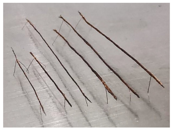 As the tip of the copper wire weight is hard and uneven, which will damage the 1.2 μm-thick silicon nitride diaphragm of the tactile sensor when the copper wire weight is placed on the silicon nitride diaphragm, the surface of the copper wire weight is wrapped with a layer of HT901 silicon adhesive sealant and cured for 24 h at room temperature to make soften the tip of the copper wire weight. A layer of CRC PLASTICOTE 70 clear protective lacquer is then coated on the surface of the cured silicon adhesive sealant and cured for 12 h at room temperature to prevent the adhesive force of the silicon adhesive sealant from damaging the 1.2 μm-thick silicon nitride diaphragm, as shown in Figure 14. The masses of the different beam-shaped copper wire weights are measured using a Mettler Toledo AL104, with a readability of 0.1 mg, and the test results are shown in Table 1. The different masses of the manufactured beam-shaped copper wire weights are shown in Figure 15.