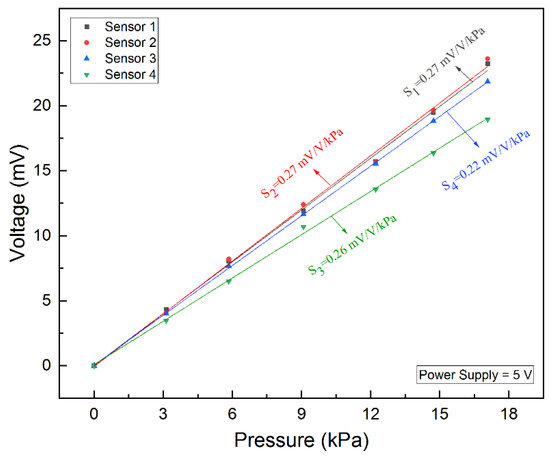 The experimental setup used for measuring the sensitivity of the tactile sensor is shown in Figure 16. As shown in Figure 16, the input voltage of the Wheatstone bridge formed by the four piezoresistors of the transferred tactile sensor was first set to 5 V by Agilent E3631A (Agilent Tec., Santa Clara, CA, USA), and the corresponding output voltage value of the Wheatstone bridge was then recorded using Agilent 34401A when different masses of the beam-shaped copper wire weights were placed on the force area of the transferred tactile sensor under the microscope. The sensitivity measurement results of the tactile sensors are shown in Figure 17. As Figure 17 shows, the power supply of the transferred tactile sensor is 5 V, the output voltage of the Wheatstone bridge changes from 0 to 23.22 mV when the pressure applied to the transferred tactile sensors changes from 0 to 17.1 kPa, and the sensitivity of the four transferred tactile sensors are 0.22 mV/V/kPa, 0.26 mV/V/kPa, 0.27 mV/V/kPa and 0.27 mV/V/kPa, separately.