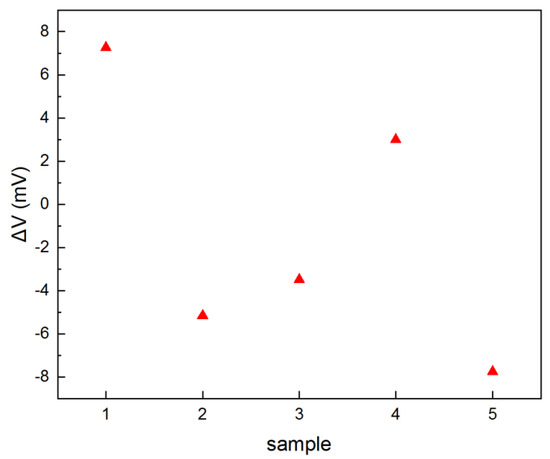 Because the stress caused by the Au–Si eutectic flip-chip bonding process will affect the resistance of the four piezoresistors slightly, the output voltages of the Wheatstone bridge of the transferred tactile sensor were measured by an MPI TS2000-SE four-point probe before and after the flip-chip bonding process to estimate the stress caused by the Au–Si eutectic flip-chip bonding process, and the test result is shown in Figure 18. As Figure 18 shows, the output voltage difference of the Wheatstone bridge before and after the flip-chip bonding process was obtained from −7.76 to +7.25 mV, and the corresponding stress can be calculated from −5.83 kPa to +5.54 kPa, which indicated that the stress caused by the Au–Si eutectic flip-chip bonding process can be acceptable [32].