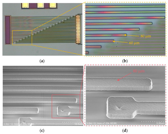 The shear strength of the Au–Si eutectic bonding was tested using a Dage Series 4000 Bondtester (Nordson TEST & INSPECTION, Aylesbury, Buckinghamshire, UK), and the test structure is shown in Figure 4a. The area of the metal electrodes used for the Au–Si eutectic bond was approximately 0.34 . The shear strength of the bonded test structure was approximately 30.74 MPa. To estimate the temporary bonding strength caused by stiction, the tips of silicon nitride cantilever beams with a length larger than 80 μm were then bonded to the substrate after the designed test structures shown in Figure 4b were placed in deionized (DI) water for 24 h and dried at room temperature for 24 h. The optical microscopic and SEM views of the cantilever beams are shown in Figure 19a–d, respectively. As the designed distance between the silicon nitride cantilever beams and substrate was 1 μm, using Equation (6), the temporary bonding strength can be calculated to be larger than 7.06 kPa and less than 22.31 kPa. Due to the bonding strength of the transferred tactile sensors are much larger than the temporary bonding strength caused by stiction, the tactile sensors can be easily transferred to the reroute substrate, and the yield of the transferred tactile sensors is as high as 90%.