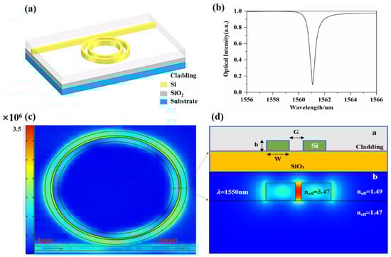 (a) Schematic diagram of the structure, (b) transmission line of the microring resonator (coupling gap is 100 nm), (c) resonant state mode distribution diagram of the resonator cavity, and (d) cross-sectional structure diagram and mode distribution diagram.