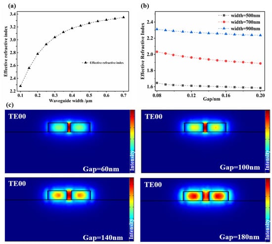 (a) The relationship between different waveguide widths and the effective refractive index, (b) the relationship between different waveguide widths/gaps and the effective refractive index, and (c) the electric field pattern distribution diagram with a width of 450 nm and different gaps.