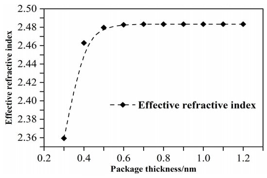 In order to obtain a better interaction between acoustic waves and light fields, acoustic wave sensors based on optical microcavities, generally, use polymers with a lower Young’s modulus (GPa) as the encapsulation layer. In this study, PMMA was selected as the encapsulation material, and its Young’s modulus was 3 GPa. PMMA has a larger elastic modulus and a smaller Young’s modulus, which is more effective as a coating material. The thickness of the coating layer has an impact on the performance of the sensor, and the coating thickness of PMMA needs to be studied. Figure 3 is the relationship curve between different encapsulation thicknesses and the effective refractive index. After the analysis, the PMMA encapsulation thickness is selected as 0.45 μm. Since the thickness of Si is 220 nm, less than the thickness of PMMA, PMMA can also play a protective role.