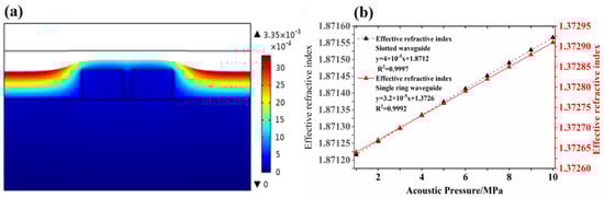Figure 4a shows a deformation diagram of the sensor under the action of 1MPa sound pressure after the simulation analysis. Figure 4b is the relationship between the effective refractive index and the sound pressure calculated after comprehensively considering the effects of deformation and the elasto-optical effects on the effective refractive index of single-ring and grooved waveguides. After linear fitting, the relationship between the effective refractive index and the sound pressure of the grooved waveguide under different sound pressures is expressed as follows: