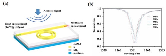 After the simulation analysis, the photoacoustic coupling model of the acoustic sensor is shown in Figure 5a. The input light wavelength is 1.55 μm, and the input light power is 1 mW. In this calculation of the acoustic wave pressure of the output optical power under different sound pressures, the color signal represents the applied acoustic signal, the green arrow represents the input light, and the red arrow represents the output light intensity. A waveguide resonant cavity with a bending radius of 5 μm is selected, with a resonant wavelength of 1561.08 nm as the reference, starting from the sound pressure of 1 MPa; the pressure adjustment step is 1 MPa. The spectrum response curve of the microcavity under different sound pressures is shown in Figure 5b. From the simulation analysis results, it can be concluded that, as the pressure increases, the resonance peak has a 40 pm/MPa linear red shift. According to the resonance Equation (2), the relationship between the resonance wavelength shift and the sound pressure is expressed as follows: