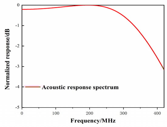 wherein represents the normalized frequency response, k represents the acoustic wave vector, represents the thickness of the polymer material, T represents the pressure amplitude transmission coefficient, and and represent the amplitude reflection coefficient. Given that the thickness of PMMA polymer material is 2 μm, the acoustic impedance of PMMA is 3.2 × 106 Kg/(sm2), the acoustic impedance of silicon dioxide is 1.31 × 107 Kg/(sm2), and the acoustic impedance of seawater is 1.62 × 106 Kg/(sm2). The frequency response can be calculated as shown in Figure 6. The 3 dB bandwidth of the sensor is 430 MHz.