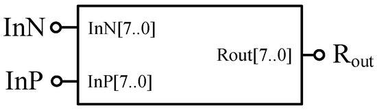 According to the second part of the HP memristor threshold characteristics, this paper establishes the corresponding memristor model in FPGA, as shown in Figure 2. In order to highlight the characteristics of the memristor as a bipolar memory device in Quartus II as show in Figure 1, two input terminals InP and InN need to be designed in this model; concretely, InP represents the positive memristor input electrode while InN represents the negative memristor input electrode. One output terminal Rout is needed to be established to show the corresponding value of the memristor. The 8-bit binary numbers InP [7..0], InN [7..0] and Rout [7..0] are used to represent the forward input voltage, reverse input voltage, and the memristance of the memristor at each voltage, respectively. The data in this design are set to be 8-bit binary number, to ensure the needs of the subsequent computing module, because fewer bits are possible to make overflow during calculation.
