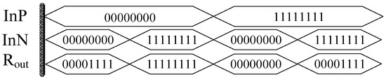According to the analysis in the previous section, when VInP > VInN, the memristor is in the forward conducting state, and the memristor’s value is RON, then Rout [7..0] = 00000000; on the contrary, Rout [7..0] = 11111111, which means that the memristor resistance value is ROFF; when VInP = VInN, Rout [7..0] = 00001111, which means the memristance does not change.