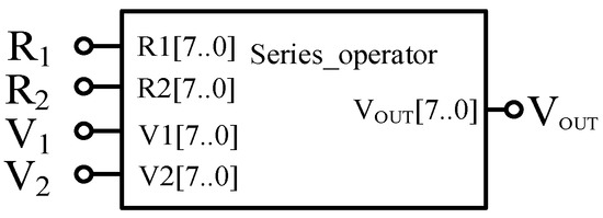 From the above analysis, to realize the memristor based AND gate and OR gate circuit through FPGA, the two memristors need to be designed in series. Therefore, it is necessary to design a basic operation module to simulate the operation in the actual circuit, as shown in Figure 5. Among them, the input terminals R1 and R2 are, respectively, connected with the output terminals of the two memristors in series, that is, the memristor values Rout1 and Rout2 of the two memristors; the input terminals V1 and V2 are respectively connected with the two input terminals of the series circuit; the output of the module is the voltage value VOUT at the two memristors in series. The module can distinguish whether each memristor is currently in forward bias or reverse bias by the value of V1 and V2, so as to obtain the memristor values of the two memristors under the input voltage, and assign the values to R1 and R2, and calculate according to Equation (3) to obtain the corresponding output value.