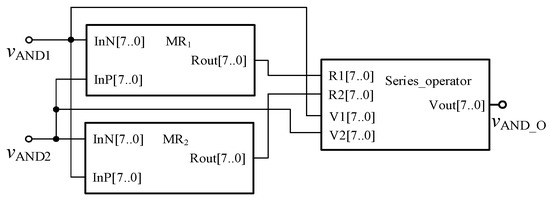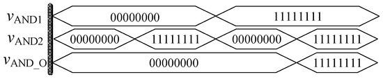 In order to verify the correctness of the design, the threshold memristor designed in the previous section and the series operation module established in this section can be used in Quartus II, and the simulation circuit of the AND gate is shown in Figure 6. The negative inputs of the two memristors are used as the input terminals of the whole AND gate, and the Rout outputs the memristor state according to the level of the input terminal. Then, the output of the whole AND gate is further obtained after the operation of the operation module according to Equation (3). The simulation results are shown in Figure 7. When both VAND1 and VAND2 are high level “11111111” or both are low level “00000000”, the output VAND_O is the same as the input. When VAND1 and VAND2 input different values, the output result represents the low level of 00000000. Therefore, the AND gate circuit designed in this paper is effective. Figure 8 shows the module diagram of the AND gate logic circuit after encapsulation.
