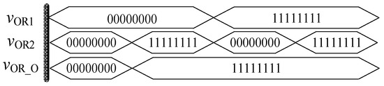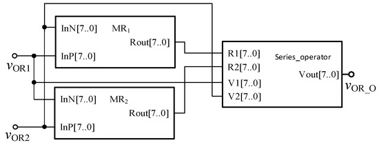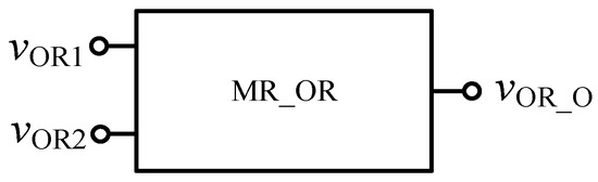 Similarly, in order to verify the effectiveness of OR gate circuit, the simulation circuit of OR gate is established as shown in Figure 9. The simulation results of Quartus II are shown in Figure 10, and Figure 11 is the module diagram after encapsulation of the OR gate logic circuit. It can be seen from the waveform simulation diagram of the OR gate in Figure 10 that when the input VOR1 and VOR2 are both high or both low, the voltage across the memristor is the same, and the output is the same as the input. When VOR1 and VOR2 are different input values, the output result is high level. Therefore, the OR gate designed in this paper is effective.