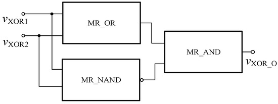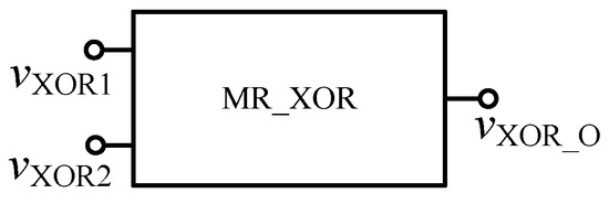 The FPGA XOR gate based on the memristor can be composed of the memristor AND gate, OR gate and NAND gate, and can be realized according to Equation (5). The specific circuit is shown in Figure 16, and the encapsulated model is shown in Figure 17.