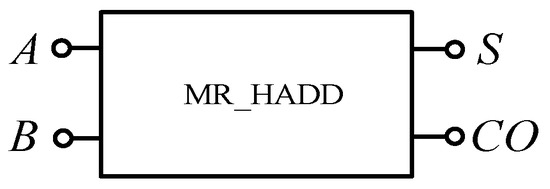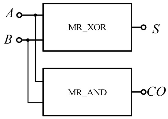 The half adder is the simplest addition circuit. It adds two 1-bit binary numbers A and B to produce sum S and carry CO. The output expression of the half adder is shown in Equation (6), that is, it is composed of an XOR gate and an AND gate. In this paper, a half adder circuit is realized using a memristor-based XOR gate and AND gate shown in Figure 19. Since the carry from low bit is not considered in addition here, the circuit shown in Figure 19 can only be called a half adder, and the encapsulated module is shown in Figure 20.