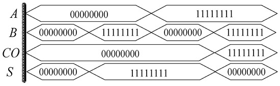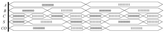 Figure 24 shows the simulation circuit results of a full adder based on a memristor built in Quartus II software. Similar to the half adder, 00,000,000 is equivalent to 1-bit binary data “0”, and 11,111,111 is equivalent to 1-bit binary data “1”. When A, B and C of the full adder are all “0”, the standard S and carry CO of the output end are all “0”; when any one of A, B and C is “1” and the other two are “0”, then S is “1” and carry CO is “0”; when any one of A, B and C is “0” and the other two are “1”,then S is “0” and carry CO is “1”; when A, B and C are all “1”, then S is “0”, carry CO is “1”; when A, B and C are “1”, then S is “0”, and carry CO is “0” when A, B and C are all “1”, then S is “1”, and CO is “1”. The design conforms to the logic rules of a full adder.