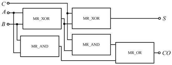 A logic circuit that adding two binary numbers and considering carry from the low bit to the high bit is called the full adder. The full adder not only considers the addition of two binary numbers, but also takes the carry from the low bit into the addition operation. The expression of the full adder is shown in Equation (7), where A and B are addends, C is the carry digit of the low order, S is the standard sum value, and CO is the carry forward to the high order.