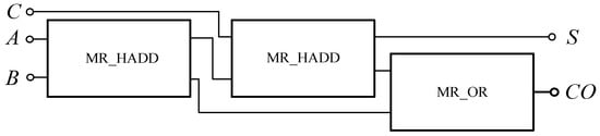 The full adder circuit can be constructed with the memristor-based AND gate, OR gate and XOR gate according to Equation (7), as shown in Figure 22. It can also be composed of two half adders and one OR gate. Figure 23 shows a full adder circuit composed of memristor-based half adders.