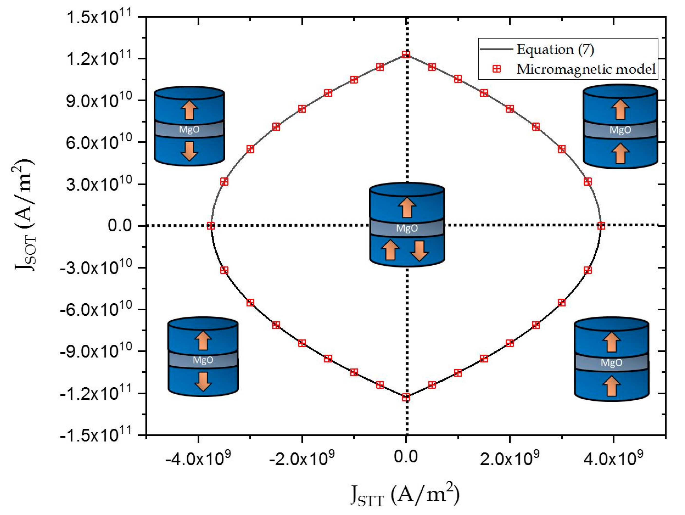 - Taniguchi, T.; Mitani, S.; Hayashi, M. Critical current destabilizing perpendicular magnetization by the spin Hall effect. Phys. Rev. B 2015, 92, 024428. [Google Scholar] [CrossRef]