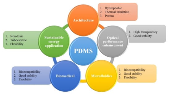 The characteristics of PDMS make it become a well-known material, the applications corresponding to each feature is shown in Figure 1. Its excellent light transmittance is often used in optical research and anti-reflective film applications. By mixing elastomer and curing agent to adjust the Young’s coefficient and thermosetting characteristic, the required micro-nano structure can be achieved and adjusted to meet the applications. The non-toxic, biocompatible, good stability, and flexible properties have made PDMS a well-known microfluidics template, which will be discussed in this short review. With integrating the laser processing, the advantages of reducing the cost and shortening the process time can be achieved. Furthermore, researchers have also focused on the triboelectric/dielectric properties, including a variety of sensors [,,,,,,,,,] produced by composite structures from PDMS and other materials. Triboelectric properties are the main reason for research on TENG in recent years. Compared with other triboelectric materials, PDMS has the advantages of good flexibility, being light weight, and having good biocompatibility. In addition to power generation, it is currently used in sensing, wearable devices, and human machine interface applications.