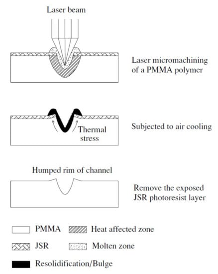 - Chung, C.K.; Lin, Y.C.; Huang, G.R. Bulge formation and improvement of the polymer in CO2 laser micromachining. J. Micromech. Microeng. 2005, 15, 1878. [Google Scholar] [CrossRef]