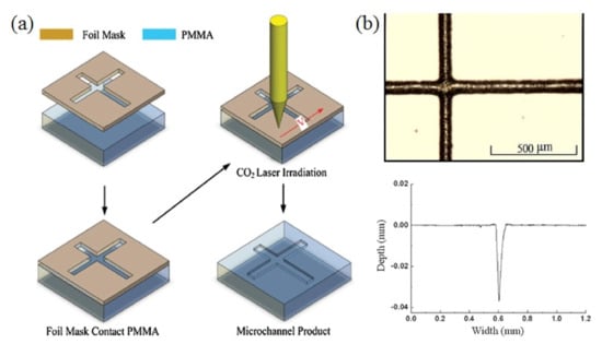 The schematic process flow of the Foil-Assisted CO2 Laser Micromachining (FACLAM) is shown in Figure 3a for ablating the PMMA cross-microchannel. The bulges and feature sizes of channels (Figure 3b,c) can be highly decreased due to reducing the surface temperature with the assistance of a metal mask that may block and conduct the remaining heat out during ablation. It includes the metal foil mask on 2 mm thick PMMA and the scanning CO2 laser source. The metal mask made of SUS-304 stainless steel film may physically limit the featured width of channel less than the laser spot size, hinder the bulge formation from resolidification, and reduce the HAZ around the channel by thermally conducting heat away from the ablated channel. It is noted that no clogging is found on the cross junction.