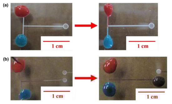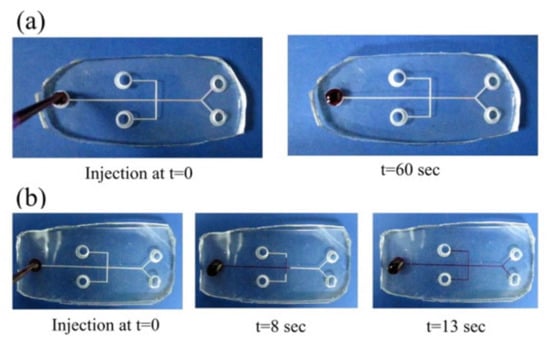 The capillary-driven flow test is performed using the Rhodamine B dye injected into the two PDMS microchips 2 h after O2 plasma treatment and 420 h after O2-plasma-PEG treatment, respectively, as shown in Figure 12a,b. There is no capillary flow of Rhodamine B into the microchannel of the O2 plasma-PDMS chip after 60 s (Figure 12a) while the O2 plasma-PEG-PDMS chip clearly exhibits the capillary flow to half of the full channel after 8 s, and completely through the microchannel after 13 s (Figure 12b). The mean flow velocity of Rhodamine B calculated is about 3.85 mm/s. This manifests that the hydrophobic recovery occurs in the O2-PDMS chip after 2 h but the O2-PEG-PDMS chip retains the hydrophilicity property for 420 h and more. It is in good agreement with the contact angle measurement and microstructure analysis. The long storage of the hydrophilic O2-PEG-PDMS chip still makes liquid flow smoothly. This indicates that the capillary microfluidic system may be realized using this long-term hydrophilic modification for the O2-PEG-PDMS chip. For capillary flow of two fluids to mix in the microchannel, the trigger valve design is important for the fluid flow with delay regarding the wait for the other to merge toward the mixing unit [].
