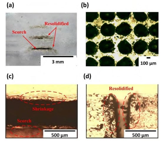 The optical micrographs (OM) of the directly ablated PDMS channels or holes using direct CO2 laser processing in air for one pass are shown in Figure 5. The traditional laser ablated PDMS drawbacks occur clearly. Figure 5a is the full-view image of the channel sample. Figure 5b shows the array of holes with the bulge around the circles’ rims. Figure 5c,d shows the defects of scorches with shrinkage and resolidification formed around the microchannel ablated in air. They are related to the photo-thermal mechanism during ablation without directly breaking chemical bonds. The large temperature gradient easily leads to the distortion of PDMS material during CO2 laser ablation through the melting, decomposing, and then vaporizing from the molten material. In conventional Gaussian distribution of the laser energy, it is mostly focused on the center and dispersed around the working area. Figure 5c shows the heat accumulation induced scorches formation and a slight shrinkage at both sides of the channel during laser ablation. Figure 5d displays the debris on the channel edges due to the resolidification of splashing or surface-tension-driven molten polymer by air cooling. So, the thermal defects of scorched, shrunken, and resolidification of the PDMS is easy to form on the surface after laser ablation.