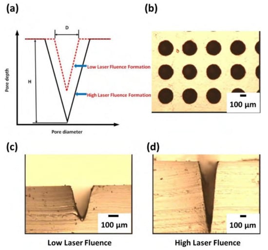 The problem of direct PDMS ablation in air can be improved using the integration process of the laser ablated PMMA mold together with PDMS casting and/or two-step PDMS casting for dual-tone microstructure conversion. The schematic high and low laser fluences of Gaussian-like distribution are shown in Figure 6a for the ablated profiles of PMMA. The greater ablation depth and wider diameter of the PMMA profile are formed at the higher laser fluence with more input laser energy. The ablated PMMA holes array ablated by direct CO2 laser processing in air for one pass at a proper laser parameter is shown in Figure 6b for an average diameter of about 280 μm in a good surface quality. A different featured profile can be fabricated by adjusting the laser power, scanning speed, and pass during ablation. The cross-sectional images of the PMMA microneedles master molds at low and high powers at a constant scanning speed are shown in Figure 6c,d, respectively. The higher laser power results in a higher ablation depth.