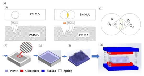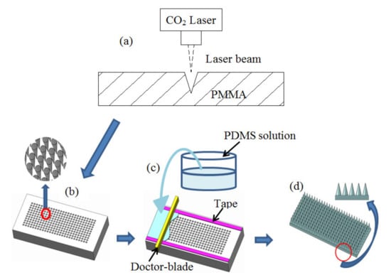 Polydimethylsiloxane (PDMS) is a well-known functional material in fields of architecture [,], optical performance enhancement [,,,,], microfluidics [,,,,,,,], chemistry and biomedical [,], microneedles [,,,,,,,], and the sustainable energy application of a triboelectrical nanogenerator (TENG) [,,,,,,,]. Solid PDMS has advantages of non-toxic, hydrophobic, transparent, and controllable Young’s modulus. The material cost of PDMS is much lower than that of silicon and glass wafers, and its light transmittance, good biocompatibility, and its ability to easily bond with a variety of materials at room temperature attract much attention. Several polymer materials such as polymethyl methacrylate (PMMA), PDMS, polycarbonate, cycloolefin polymer, and copolymers, and so on have also been used for microsystem technology combined with the Si and glass micromachining, bonding, and/or surface modification []. In terms of the microfabrication and design of microfluidics application, the micropumps, micromixers, and/or microreactors are the basic components. The active micromixers and micropumps are involved in the high-cost complicated fabrication and external power input, therefore the passive micromixers and self-driven capillary pumping are more popular and widely studied []. Passive micromixers with effective mixing efficiency, the capillary pumping with long-term hydrophilicity, and an easy fabrication process are the main goal for research and practical use. The early microfluidics and biomedical template are based on the silicon or glass substrate combined with the photolithography process by SU-8 thick photoresist; some laser ablated polymer PMMA templates are also applied due to low cost and easy fabrication [,,,]. The above SU-8 and PMMA templates for casting PDMS microchannels are widely used in microfluidics. The PDMS microfluidics offer several advantages such as flexibility, low environmental impact, biocompatibility, and good chemical stability for bulk production, making them the most promising materials for microsystem technology for micromixers and micropumps. In terms of microfabrication and design of PDMS advances for microneedles [,,,,,,,] and for TENG sustainable energy application, the laser ablated PMMA master mold is used to fabricate various PDMS microstructures. The TENG fabrication is fast and cost effective for harvesting mechanical energy. Selecting two suitable triboelectric materials can produce high open-circuit voltage and enough power for portable electronic devices of which the TENG performance is related to the material microstructure, process parameters, and device assembly. This sustainable energy application has greatly been developed in wearable devices, sensors, and human-machine interfaces from now to the future [,,,,,].