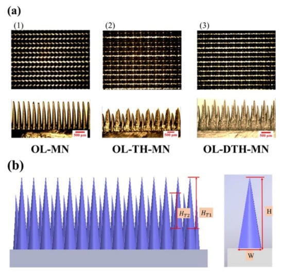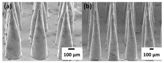 SEM micrographs of the cast PDMS microneedles array from the PMMA mold ablated at laser powers of: (a) 3 W and (b) 10 W at a constant 114 mm s−1 speed.