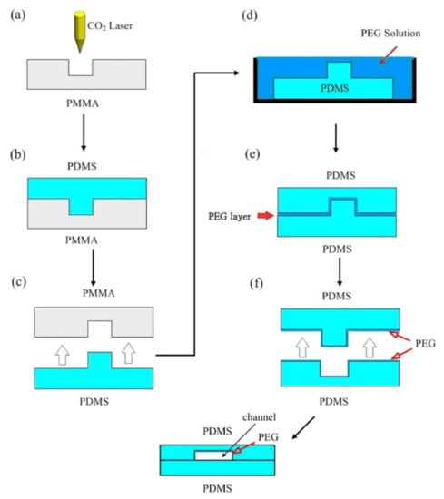 The scheme of fabricating the all PDMS microfluidic chip using CO2 laser ablation, surface modification, and two-step casting is shown in Figure 9. First, the designed microchannel structure is formed on PMMA by a CO2 laser ablation (Figure 9a). The well-mixed PDMS solution in a weight ratio of 10:1 (elastomer to hardener) was placed in a vacuum pump to remove any air bubbles, poured onto the PMMA master mold, cured at 70 °C for 30 min, and cooled to ambient temperature (Figure 9b). Then a PDMS convex mold was stripped from the PMMA mother mold (Figure 9c). The O2 plasma was used for surface modification of the PDMS mold for 1 min and then the mold was immersed in a PEG solution (Figure 9d). The PDMS convex mold was used for the second casting following the steps in Figure 9b,c to form the PDMS concave microstructure and the bonding with a flat PDMS to form the microfluidic chip (Figure 9e,f and the final chip). The integrated process for all PDMS microfluidic chips is much faster and cheaper compared with the conventional photolithography-based technology. In order to assess the long-term hydrophilic behavior measured by surface contact angle, three kinds of surface treatment method are applied, that is, the O2 plasma, the PEG coating, and the O2 plasma followed by PEG (O2-plasma-PEG) coating before the chip bonding. The PDMS sample activated by O2 plasma is performed using a 30 W RF power at 500 mTorr for 60 s. The PDMS sample coated with a PEG film is dipped in a PEG solution of 0.1 M for 25~30 min.