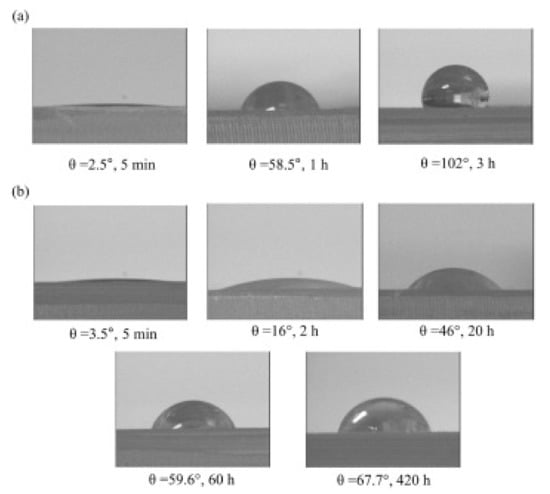 Optical micrographs of the contact angle of a DI water droplet on the PDMS substrate: (a) 5 min, 1 h, and 3 h after pure O2-plasma treatment; (b) 5 min, 2 h, 20 h, 60 h, and 420 h after O2-plasma-PEG treatment.