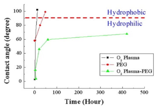 The contact angle is a function of the retaining time of PDMS after different treatment methods i.e., the O2 plasma, the PEG, and the O2-plasma-PEG modification.