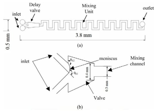 Figure 13 shows the schematic diagram of the designed meander micromixer with an open surface, a triggering valve, and nine mixing units with a chip size of 50 mm (L) × 20 mm (W). The triggering valve is crucial for the capillary micromixer. An important parameter of the expansion angle is defined as the opening angle in the triggering valve. The fluid cannot flow forward if the merged expansion angle and contact angle is larger than 90°, that is, the stop-valve effect. In contrast, the so-called delay-valve effect occurs to decrease the fluid speed within the channel as the expansion angle is larger than 0°, combined with a contact angle less than 90°. It is noted that the delay valve effect makes the injected fluid unable to advance forward without meeting the other fluid at the triggering valve. The design of triggering delay-valve is important for the arrival of two fluids before mixing without the backflow problem. The surface tension of fluid on the channel wall of the valve decides the contact angle in the valve that dominates the capillary flow in the microchannel. In addition, whether the fluid advances in the channel or not is affected by the capillary pressure in a channel.