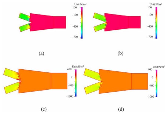 The CFD-ACE simulation results of valve pressure difference of the closed channel (a,b) and the open-surface channel (c,d) before and after the triggering effect.