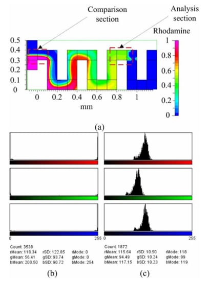 The CFD-ACE simulated mixing extent of the meander micromixer at: (a) Comparison position and analysis position, (b) RGB concentration at comparison position, and (c) RGB concentration at analysis position.
