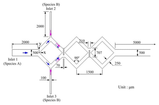 High-efficiency mixing in a micromixer is crucial for reaction and detection uniformity in microfluidic systems [,,,,,,,,,,], a micro total analysis system (µ-TAS), or lab-on-a-chip (LOC) applications [,,,,,]. The micromixers are divided into two main kinds of types i.e., active and passive ones to study the design, structure, fabrication, mechanism, and assembly on mixing enhancement. Lukyanenko et al. [] proposed that an active mixer for dried reagents was made from an electro-mechanical speaker’s membrane which was connected to the input of the chip. Cortelezzi et al. [] presented a geometrically scalable active micro-mixer suitable for biomedical and bioengineering applications and potentially assimilable in a lab-on-chip. Compared to the passive ones, the active microfluidic system may bring benefit to good mixing efficiency at a shorter channel length with less mixing time using the acoustic force and magneto hydrodynamics mixers. However, there are accompanying problems such as the extra power source, complex structure, time lengths, and high-cost fabrication. On the other hand, the passive microfluidic system has the advantages of concise design and easy fabrication for good mixing under proper design of the microstructure. The passive microfluidic system generally has two types of microchannel structures i.e., the 3D structure and the 2D planar one to mix fluids through the convection-chaotic-vortex effect or the diffusion effect. Bell et al. [] proposed a planar gravity perfusion system that exploits the strong capillary action in the flow chamber as a passive limit-valve. Gidde et al. [] presented that passive planar micromixers based on circular and square mixing chambers spaced at an equidistant along the length of a micromixer could operate in the laminar flow regime for a high mixing index. Rampalli et al. [] proposed that a serpentine square convergent-divergent micromixer is a simple and effective passive device for micromixing. Compared to 2D planar passive microfluidics, the 3D ones [,,,,,,] benefit the structure-enhanced repeated mixing for good efficiency.