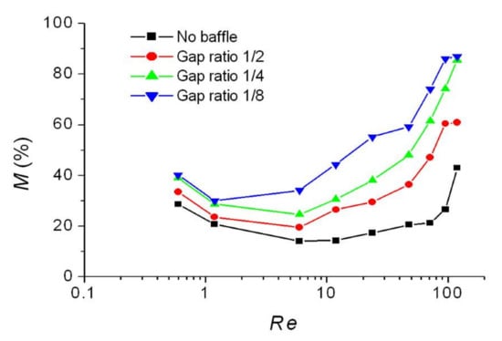 The three-rhombus micromixers with different gap ratios (1/2, 1/4, and 1/8) were investigated at different Reynolds numbers (Re). Figure 19 shows the mixing efficiency of the three-rhombus micromixers with different gap ratios as a function of Reynolds number. Variation in mixing efficiency also shows two mixing regions, diffusion region, and convection region. In the diffusion region, an increase in mixing efficiency with a decreasing gap ratio is not very obvious. For example, the mixing efficiency of the rhombic micromixer without baffles is 28.7% at Re 0.595. For gap ratios of 1/4 and 1/8, the mixing efficiency increases from 28.7% to 39.1% and 40.2% because of baffle constriction.