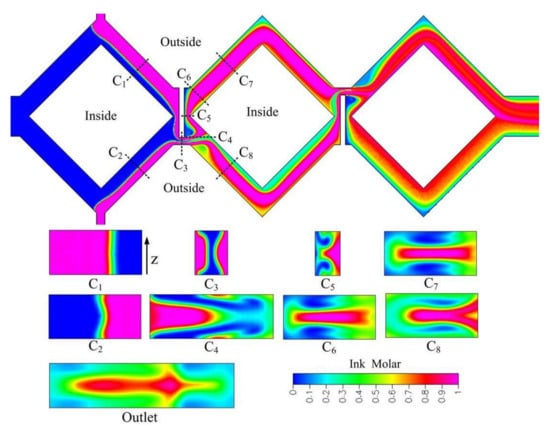 As gap ratio is decreased from 1/4 to 1/8, focusing and stretching effects will be stronger. Figure 20 shows concentration distributions of the cross sections C1-C8 and outlet of the rhombic micromixer with a gap ratio of 1/8 at Re 23.8. Resident time and distorted interfaces in cross section C3-C8 are similar between a gap ratio of 1/4 and 1/8. Due to stronger focusing effect, better mixing in cross section C5, C7, and C8 can be obtained compared with a gap ratio of 1/4. In addition, improved mixing can be obtained at the outlet.