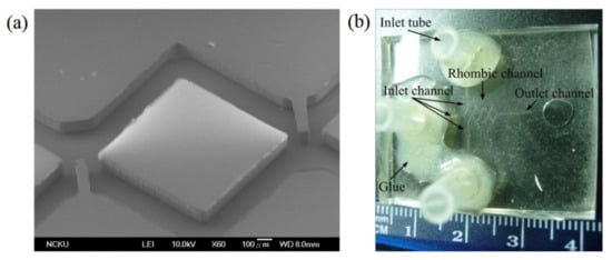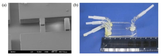 Beside the fabrication of the rhombic micromixers, an obstacled micromixer had also been fabricated by using the same fabrication process and parameters. One-step lithography, PDMS casting, and oxygen plasma-bonding techniques were used to fabricate the PDMS-based obstacled micromixers. Figure 24a shows the SEM image of the replicated PDMS layer with a gap ratio of 1/8. This replicated PDMS channel layer was further bonded with another PDMS layer by using oxygen plasma treatment. In order to increase the bonding strength and avoid liquid leakage, a modification time of 30 s was performed. After that, silicon tubes were glued with three punched inlet holes and one outlet hole in the PDMS-based micromixer, as shown in Figure 24b.