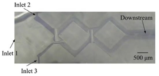 SEM image of the replicated PDMS channel layer before bonding is shown in Figure 21a This SEM image shows two baffles were added into the junction between two rhombi. Silicon tubes were used and glued to the PDMS-based micromixer, as shown in Figure 21b. There are three inlets and one outlet in this rhombic micromixer. The optical image of experimental fluid mixing in the rhombic micromixer with a gap ratio of 1/8 at Re 20 is shown in Figure 22. Increasing the Reynolds number to 20 results in much better mixing at the second and third rhombic channels.