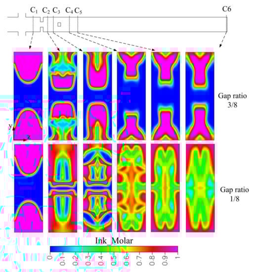 Cross-sectional concentration distributions of the three-rhombus micromixer with a gap ratio of 1/8 at Re 23.8 (x-y cross section is at half-depth plane).
