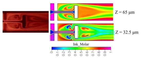 The difference of capillary pressure in the triggering valve before and after the triggering effect is simulated by CFD-ACE software. The simulate results in both the closed and open-surface channels are shown in Figure 14. For the closed channel of 250 μm before the triggering, the capillary pressure is approximately −350 Pa (N m−2) within the inlet channel to impede one fluid from advancing forward as shown in Figure 14a. As two fluids merge, the pressure increases to 70 Pa and result in the flow of fluids into the mixing channel as shown in Figure 14b. Furthermore, for the open-surface channel of 130 μm, the pressure before merging is approximately −200 Pa (N m−2) as shown in Figure 14c and enhanced to approximately 40 Pa after triggering as shown in Figure 14d. That is, the triggering effect on the capillary pressure in the open-surface microchannel is lower than the closed channel. This indicates that the open-surface microchannel can use a lower capillary pressure to actuate fluid flow than the closed channel due to a lack of the upper cover. Another advantage of the designed open-surface channel with the lower capillary pressure difference is to decrease the bubble formation during the fluid flow due to the flow velocity discontinuity from the varied angle, width, and resistance with surface morphology. Lower flow resistance from smaller pressure difference may reduce the formation of bubble nuclei at the channel intersect and corner of the valve. In other words, the open-surface channel of three walls results in a lower difference of capillary pressure for a lower probability of bubble formation compared to the closed channel of four walls leads. Using the triggering-delay valve and open-surface microchannel design can promote the problems of backflow and bubble formation due to the reduced pressure difference within the channel.