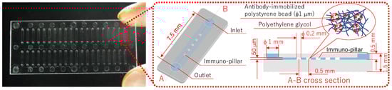 A vortex mixer was used to stir a mixed solution of PEG-based photocrosslinkable prepolymer MI-1 (50 μL, Kansai Paint Co.,Ltd., Osaka, Japan), photo-initiator PIR-1 (5 μL, Kansai Paint Co.,Ltd., Osaka, Japan), PBS (125 μL), and anti-human MCP-1 monoclonal antibody-immobilized polystyrene bead emulsion (180 μL). Thereafter, this solution was introduced into the microchannels via a pipette (PIPETMAN, Gilson S.A.S., Villiers le Bel, France) and was subsequently irradiated with UV light (wavelength: 365 nm) through a photomask. Further, the photo-crosslinkable prepolymer was polymerized in the microchannel considering the pattern of the photomask. The areas that were exposed became hydrogel pillars containing approximately 3 × 105 anti-MCP-1 monoclonal antibody-immobilized polystyrene beads per pillar. Thereafter, the unreacted prepolymer was removed using an aspirator, and a washing buffer (3% BSA) was used to wash the microchannel, which also removed the polystyrene beads that leaked from the hydrogel. Moreover, to avoid loss of activity of the antibody due to drying, the microchannel was filled with washing buffer prior to use. In addition, the immuno-pillar devices for AGT and L-FABP were also fabricated in a similar manner, as mentioned above.