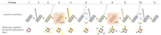 The immunoassay procedure using the immuno-pillar device is shown in Figure 2. The same procedure was followed for each biomarker. The injection and removal of the solutions (urine samples, reagents, and washing buffers) were performed using the pipette and aspirator, respectively. Further, the Alexa Fluor 488 Labeling Kit (Invitrogen, Tokyo, Japan) was used to prepare fluorescence-labeled secondary antibody immediately before the immunoassay. First, the washing buffer was removed from the microchannel (step 2) followed by the introduction of 0.25 μL of analyte solution (standard dilution solutions with known concentrations of antigen or patient urine, step 3). This was incubated for 30 s at 37 °C (step 4). Standard dilution solutions of each antigen were prepared in PBS to generate calibration curves. Following the incubation, the solution within the microchannel was removed (step 5), and the microchannel was washed three times with PBS (step 6). Thereafter, 0.25 μL of the fluorescence-labeled secondary antibody was introduced into the microchannel (step 7) and incubated for 30 s at 37 °C (step 8). Subsequently, the solution inside the microchannel was sucked (step 9) followed by washing of the immuno-pillars thrice with PBS again (step 10). Finally, the microchannel was filled with PBS (step 11) and fluorescence images of each immuno-pillar were captured using an inverted fluorescence microscope (Ti-U, Nikon, Japan) equipped with a CCD camera (EM-CCD, Hamamatsu Photonics, Japan) and a super-high-pressure mercury lamp (Nikon, Japan). Consequently, the fluorescence intensity of each immuno-pillar was calculated using the ImageJ software (NIH, Bethesda, MD, USA).