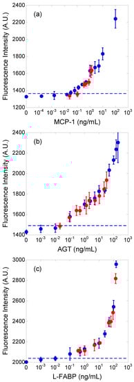Calibration curves of (a) MCP-1, (b) AGT, and (c) L-FABP. The dashed line in each figure indicates the detection limit. The blue and red plots were obtained with standard dilution solutions and human urine samples, respectively.