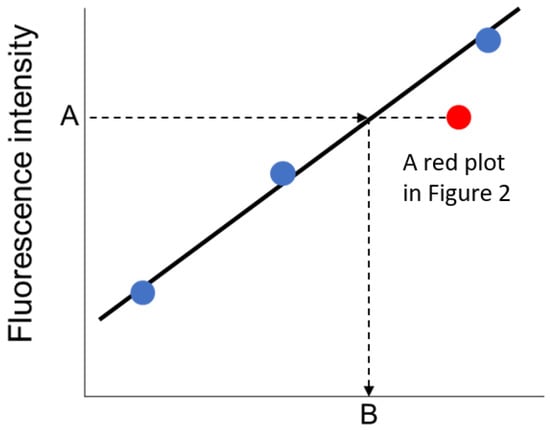 Schematic of the external standard method. Blue plots indicate nearest three data obtained by immuno-pillar devices and standard dilution solutions. (A: fluorescence intensity of immuno-pillar devices; B: concentration estimated by immuno-pillar devices).